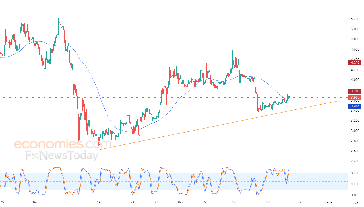 لهذا نحن نتوقع ارتفاع الزوج خلال تداولاته القادمة، خاصة في حالة اختراقه للمقاومة المهمة 3.780، ليستهدف بعدها مستوى المقاومة 4.339.