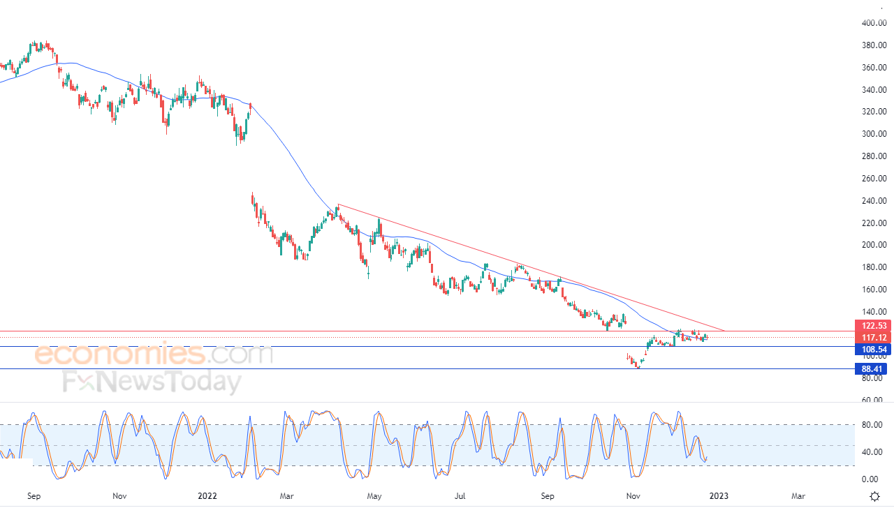 لذلك نحن نتوقع المزيد من الهبوط للسهم خلال تداولاته القادمة، طيلة ثبات المقاومة 122.53، ليستهدف أولى مستويات الدعم عند سعر 108.54.