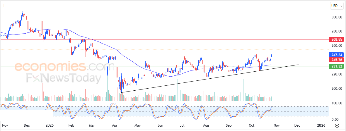 لذلك تشير توقعاتنا إلى صعود سعر السهم خلال تداولاته القادمة، خاصة في حالة اختراقه للمقاومة المذكورة 245.75$، ليستهدف بعدها مقاومته التالية عند سعر 268.85$.