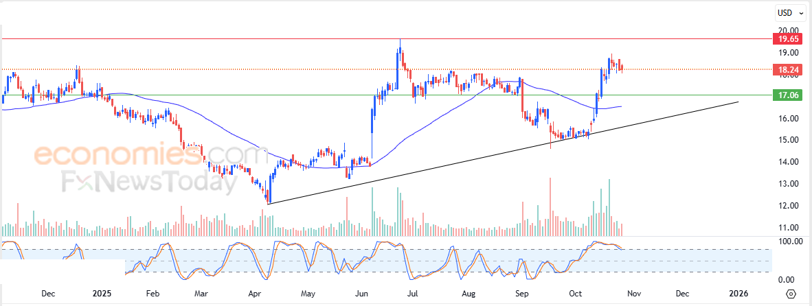 لهذا تشير توقعاتنا إلى صعود سعر السهم خلال تداولاته القادمة، طيلة ثبات مستوى الدعم 17.05$، ليستهدف مستوى المقاومة المحوري 19.65$.