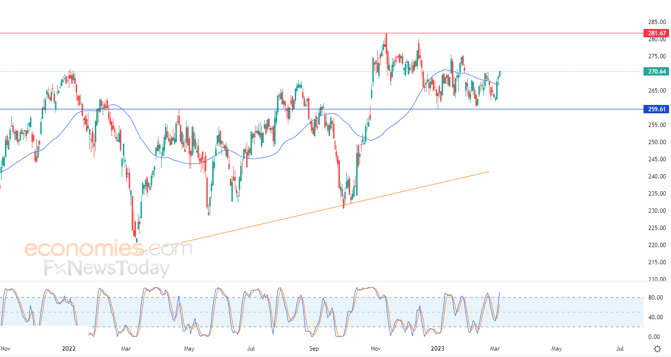 لهذا نحن نتوقع المزيد من الصعود للسهم خلال تداولاته القادمة، طيلة ثبات الدعم 259.60، ليستهدف مستوى المقاومة المحوري 281.67.