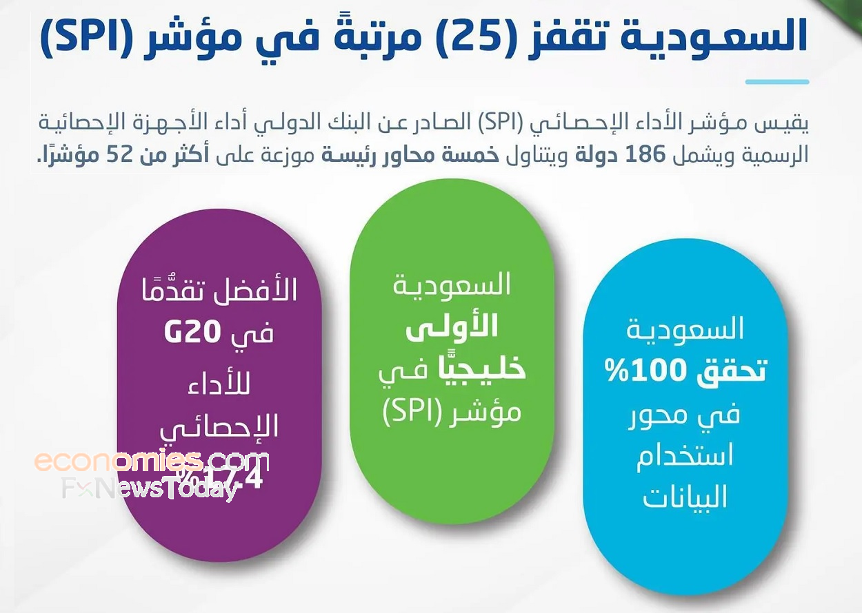 قفز ترتيب المملكة العربية السعودية ممثلةً بالهيئة العامة للإحصاء في مؤشر تقييم أداء الأجهزة الإحصائية الوطنية (SPI) الصادر عن البنك الدولي 25 مرتبةً، إذ احتلت المرتبة الأولى خليجياً، وتقدَّمت بأربع مراتب في المؤشر ذاته بين دول مجموعة العشرين (G20) حيث جاءت في المرتبة 15 بعد أن كانت في المرتبة 19 في التقييم السابق عام 2019م.
