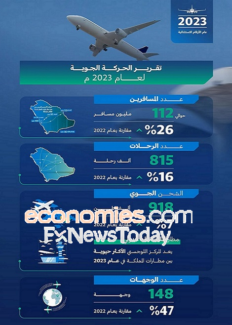 سجلت حركة النقل الجوي في المملكة العربية السعودية خلال عام 2023 رقمًا قياسيًا غير مسبوق من حيث المسافرين الذين بلغ عددهم قرابة 112 مليون مسافر عبر مختلف المطارات في المملكة، بنسبة نمو بلغت 26 % مقارنة بعام 2022م، وأكثر من 8 % مقارنة بالعام 2019م مما يؤكد تعافي قطاع النقل الجوي في المملكة من آثار جائحة كورونا.